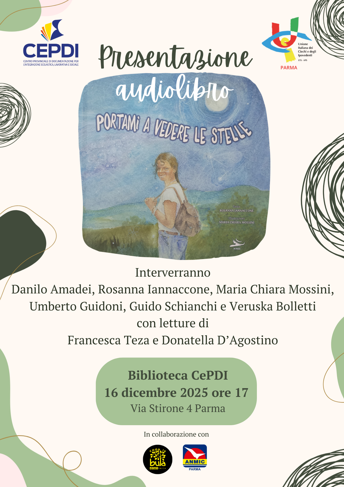 Martedì 16 dicembre, qui in biblioteca presentiamo il nostro primo audiolibro, tratto da “Portami a vedere le stelle”, una storia bellissima e dolcissima. Ecco come ce la presenta il nostro Presidente Danilo Amadei. “La morte improvvisa getta nel buio. Così é stato per Chiara. Ma la mamma e chi le ha voluto bene ed é stata amata da lei hanno fatto emergere parole, racconti, luci, fessure di pace. Le luci sono diventate racconti, immagini, un libro che ci porta “a vedere le stelle”, grazie all’aiuto della cooperativa “la bula”. Ma non é bastato. Anche chi non vede voleva leggere i bellissimi acquerelli. E così al racconto si sono affiancate le descrizioni delle illustrazioni per potere vedere il libro con l’udito, grazie al Cepdi. – Danilo Amadei” Ascolta qui l’audiolibro oppure clicca QUI per vedere e ascoltare il libro!